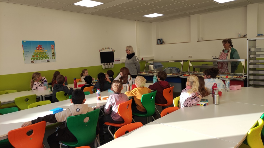 Am Freitag, 23.01.26, bekamen die ersten Klassen kulinarischen Besuch.  Die Echzeller Landfrauen kamen und bereiteten morgens in aller Frühe mit viel Liebe ein gesundes Schulfrühstück vor, das „Brotdosenfrühstück“. Klassenweise kamen die Erstklässler in die Oase, wo sie anhand der Ernährungspyramide etwas über gesunde Ernährung erfuhren.